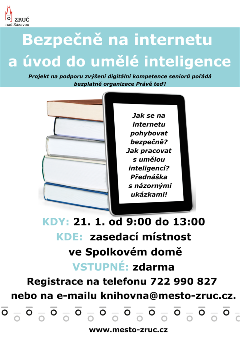 Registrace na tel. č. 722 990 827 nebo na emailu: knihovna@mesto-zruc.cz.
